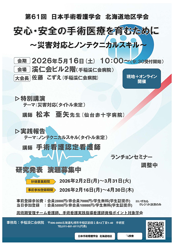 令和8年5月16日(土)に開催予定の第61回日本手術看護学会北海道地区学会総会のご案内を申し上げます。手術看護についての実践報告・看護研究などを発表しませんか。